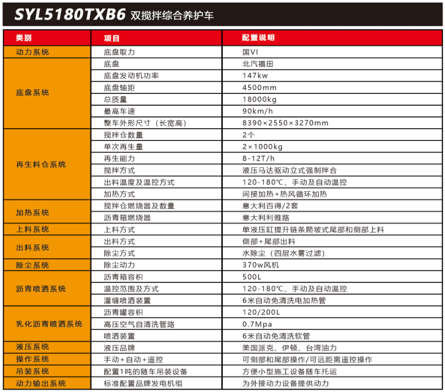 SYL5180TXB6 雙攪拌路面綜合養護車是一款集現場生產新瀝青混合料、瀝青路面冷 料、舊料、銑刨料 100%現場加熱再生利用,熱瀝青灑布、裂紋跟蹤灌縫、乳化瀝青噴灑、 為其他裝置提供電力和液壓動力等多種功能于一體的瀝青路面熱再生綜合養護車。可實現 多場合、多路面的各種類養護作業 ,養護修補費用低 ,作業快捷 ,高效率、節能環保性能突出等特點。適用于多種路況的中大施工量和高速公路的修補施工。